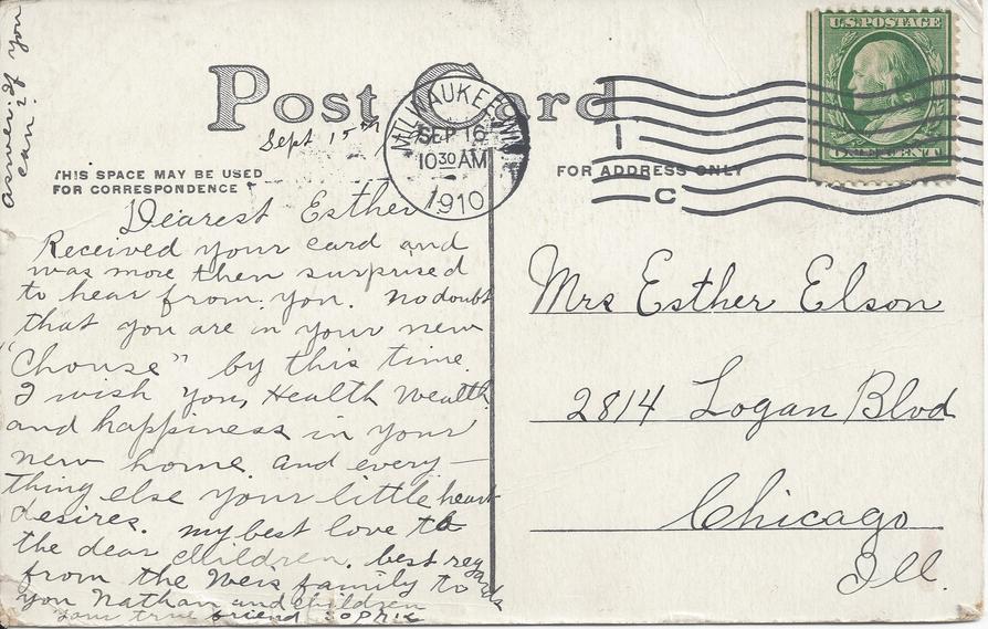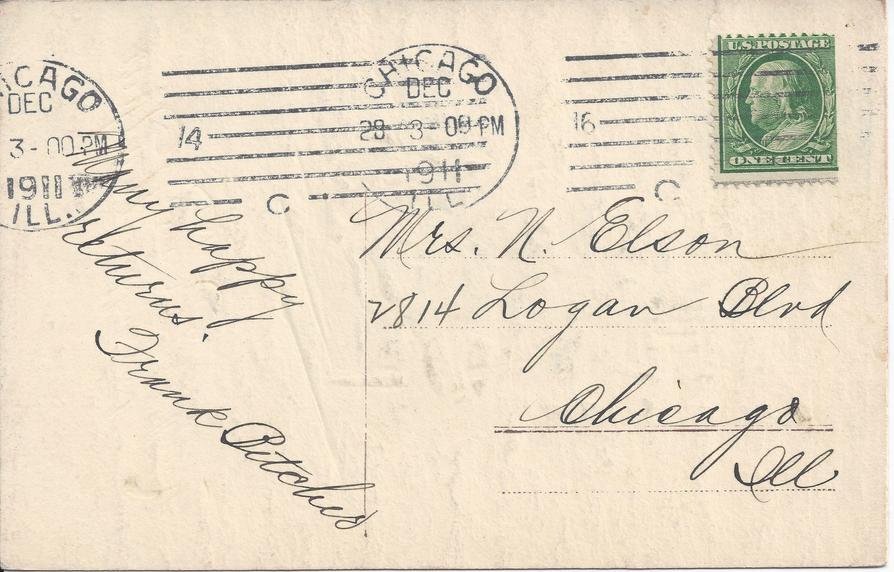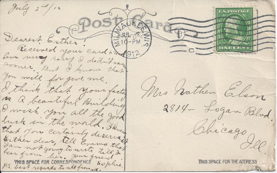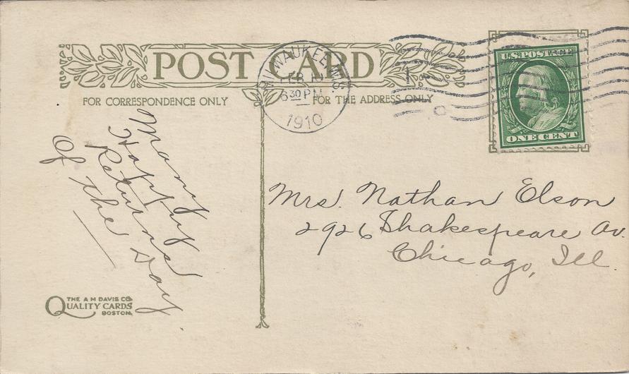On this page are the post cards from the Mary Elson Carlson Post Card Collection that were sent to Esther Elson, wife of Nathan, other than those sent by Nathan. This is page 1 of 2. They appear in chronological order, with the exception of those that are undated. They are presented in pairs, with the top image being the back (written) side of the card and the bottom being the front (design) side of the card. The buttons below provide links to the other post cards in the collection.
